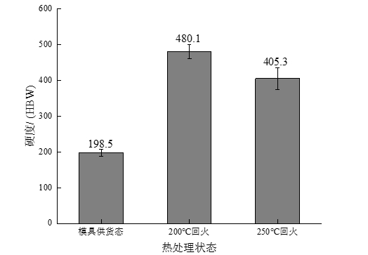 圖4:不同狀態(tài)下實(shí)驗(yàn)鋼SEM圖 2.2 拉伸力學(xué)性能 不同狀態(tài)實(shí)驗(yàn)鋼的宏觀硬度測試后結(jié)果見圖5,在經(jīng)過淬火+200 ℃回火后的實(shí)驗(yàn)鋼硬度最高達(dá)到480.1 HBW,當(dāng)回火溫度升高到250 ℃,硬度降至405.3 HBW,其原因主要是因?yàn)榈蜏鼗鼗鸬倪^程實(shí)際上就是過飽和馬氏體逐漸分解的過程,隨著回火溫度升高,碳原子活動能力增強(qiáng),固溶在馬氏體中的碳原子會逐漸進(jìn)行較長擴(kuò)散并形成細(xì)小且彌散的碳化物析出,使得馬氏體中的碳含量降低,基體發(fā)生軟化,在宏觀上表現(xiàn)出硬度下降。此外,模具供貨態(tài)實(shí)驗(yàn)鋼的硬度顯著低于經(jīng)過淬回火后的實(shí)驗(yàn)鋼的硬度,這與各自對應(yīng)的顯微組織之間的關(guān)系密不可分,模具供貨態(tài)實(shí)驗(yàn)鋼由片狀珠光體和網(wǎng)狀鐵素體組織組成,而鐵素體屬于軟相,而珠光體又是由鐵素體和滲碳體共同組成,滲碳體的存在會在一定程度上起到增加珠光體組織的硬度的作用,但由于該實(shí)驗(yàn)鋼中碳的含量為0.48%,根據(jù)杠桿定律估算,其珠光體中滲碳體所占比例大約為7%,故其鐵素體和珠光體組織兩者硬度差異并不大,都具有較低硬度。而200 ℃和250 ℃回火得到實(shí)驗(yàn)鋼基體組織為回火馬氏體組織,其組織硬度遠(yuǎn)高于珠光體和鐵素體組織,從而使得經(jīng)淬回火后的實(shí)驗(yàn)鋼硬度得到顯著提高,由此為良好耐磨性奠定了基礎(chǔ)。