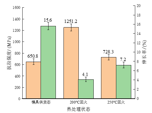 圖5:不同狀態(tài)下實(shí)驗(yàn)鋼硬度曲線圖 對不同狀態(tài)下實(shí)驗(yàn)鋼試樣進(jìn)行拉伸實(shí)驗(yàn),測得其抗拉強(qiáng)度和伸長率變化見圖6。與模具供貨態(tài)相比,經(jīng)過淬火+低溫回火后實(shí)驗(yàn)鋼的抗拉強(qiáng)度得到明顯提高,從650 MPa分別提升至1287.8 MPa和728.3 MPa。模具供貨態(tài)實(shí)驗(yàn)鋼由于其網(wǎng)狀鐵素體和魏氏組織的存在,會致使基體內(nèi)部組織的連續(xù)性受到破壞,其次還會嚴(yán)重割裂珠光體組織之間的聯(lián)系,使得其抗拉強(qiáng)度大幅度降低,而且還會在受到外力時極易發(fā)生變形與斷裂。與經(jīng)過200 ℃回火相比較而言,可以發(fā)現(xiàn)250 ℃回火后實(shí)驗(yàn)鋼的伸長率增加而抗拉強(qiáng)度降低,主要是由于實(shí)驗(yàn)鋼在經(jīng)過250 ℃回火后馬氏體得到進(jìn)一步的分解,碳原子的存在形式發(fā)生了變化,由固溶于過飽和馬氏體逐漸轉(zhuǎn)變?yōu)樘蓟铮⑦M(jìn)行析出,造成的晶格畸變效應(yīng)減弱。由于回火溫度低,析出的碳化物過于細(xì)小,使得析出物的彌散強(qiáng)化作用的效果小于過飽和度降低引起的固溶強(qiáng)化作用減弱的效果,且隨著回火溫度的升高,淬火時產(chǎn)生的內(nèi)應(yīng)力得到一定程度上的釋放,位錯密度逐漸降低,從而表現(xiàn)出抗拉強(qiáng)度升高而伸長率下降的現(xiàn)象。綜上所述,本實(shí)驗(yàn)在模具供貨態(tài)的基礎(chǔ)上對其進(jìn)行了熱處理工藝改進(jìn),在進(jìn)行了淬火和低溫回火后,實(shí)驗(yàn)鋼的強(qiáng)度和硬度均得到了明顯的提升,而經(jīng)過200 ℃回火后其硬度和抗拉強(qiáng)度最高,經(jīng)過250 ℃回火后伸長率最優(yōu),但研究主要目的在于提高其在工作環(huán)境下的耐磨性能,故需要進(jìn)一步對不同狀態(tài)下實(shí)驗(yàn)鋼耐磨性進(jìn)行對比研究。