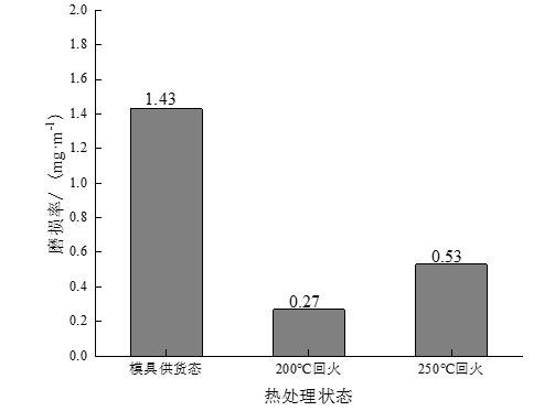 圖6:不同狀態(tài)下實(shí)驗(yàn)鋼抗拉強(qiáng)度和伸長率變化圖 2.3 耐磨性測試 圖7為不同狀態(tài)實(shí)驗(yàn)鋼在磨損時間為30 min條件下的磨損率。可以看出與模具供貨態(tài)實(shí)驗(yàn)鋼相比,經(jīng)過880 ℃淬火+200、250 ℃回火后的實(shí)驗(yàn)鋼磨損率大幅降低,其中經(jīng)過200 ℃回火的實(shí)驗(yàn)鋼磨損率最低,即具有最佳的耐磨性。
