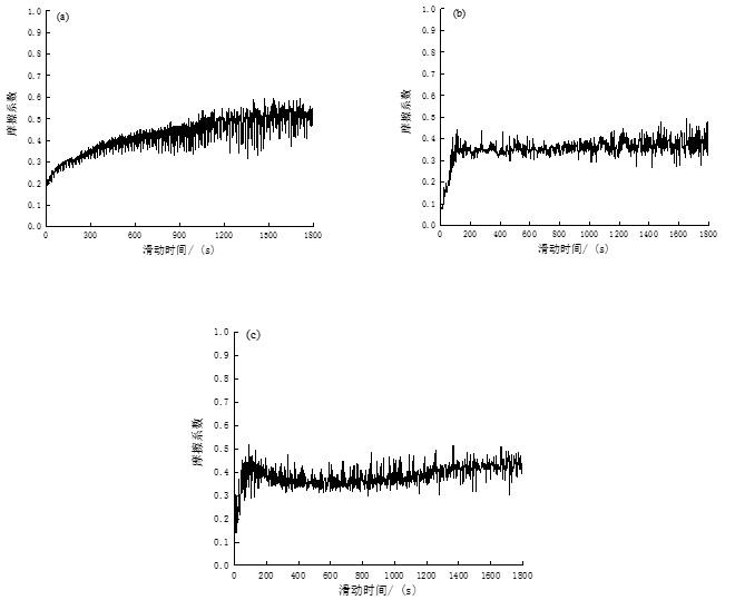 圖7:干摩擦條件下不同狀態(tài)下實(shí)驗(yàn)鋼的磨損率 圖8為3種狀態(tài)下實(shí)驗(yàn)鋼對應(yīng)的摩擦因數(shù),可以明顯看出其磨損過程均呈現(xiàn)出兩個階段。首先實(shí)驗(yàn)鋼與其對磨材料兩者接觸表面較高的微凸體之間會首先進(jìn)行點(diǎn)接觸或線接觸,并很快會在之后的磨損過程中受到碰撞而變形、斷裂或磨平,進(jìn)而有少量的磨屑隨之產(chǎn)生,而磨屑會分布在接觸表面增大摩擦表面粗糙度,造成摩擦因數(shù)逐漸升高,這一階段即為跑和時期。隨著摩擦?xí)r間增加, 在外壓力的作用下材料摩擦表面剩余的微凸體之間繼續(xù)接觸從而發(fā)生嚴(yán)重的變形和斷裂,導(dǎo)致材料表面間的接觸由最開始的點(diǎn)接觸和線接觸慢慢轉(zhuǎn)變?yōu)閮蓚€面之間的接觸,在相對運(yùn)動時實(shí)際接觸面積增大,產(chǎn)生更大的磨損,產(chǎn)生磨屑也不斷增多。 當(dāng)磨屑數(shù)量增加到一定程度,因受外壓力后逐漸形成一層具有減弱材料磨損作用的磨屑膜,且摩擦因數(shù)不再隨著磨損過程的進(jìn)行而增大,即為穩(wěn)定摩擦階段。 此外,隨著摩擦持續(xù)進(jìn)行,磨屑膜不斷遭到破壞后繼而形成新的磨屑,新的磨屑在外力的擠壓作用下逐漸形成新的磨屑膜,當(dāng)磨屑膜的形成和消失達(dá)到一個動態(tài)的平衡時, 摩擦因數(shù)就會出現(xiàn)間斷性波動。 對比3種實(shí)驗(yàn)鋼的磨損過程和摩擦因數(shù),會發(fā)現(xiàn)模具供貨態(tài)實(shí)驗(yàn)鋼在1 800 s的磨損過程中,其摩擦因數(shù)呈逐步增加的趨勢,且由圖8明顯看出在3種狀態(tài)中其摩擦因數(shù)最高,平均達(dá)到了0.51,說明其耐磨性最差,這也與在模具供貨態(tài)下磨損率最高相一致。另外,結(jié)合其顯微組織為網(wǎng)狀鐵素體和片狀珠光體兩相組織,宏觀硬度較低,耐磨性也相對較差。而實(shí)驗(yàn)鋼在經(jīng)過淬火+200 ℃,250 ℃回火后,其平均摩擦系數(shù)明顯降低,分別為0.38和0.40,與模具供貨態(tài)相比,其耐磨性得到了大幅度的改善,這與形成回火馬氏體組織之間的關(guān)系是密不可分的。