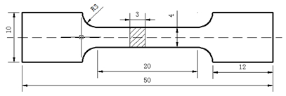 不同鑄造方式試樣經粗磨、細磨將表面磨平并拋光后,采用0.5%的HF溶液腐蝕20 s。在金相顯微鏡(4XG-MS)下觀察3種鑄件的顯微組織。采用掃描電鏡(QUANTAFG-450)觀察共晶Si相和拉伸斷口。使用X射線衍射儀(D/max-2400)進行物相分析,2θ為20°~90°,并利用Jade5.0軟件分析晶格常數。采用LFA457激光法導熱分析儀測量熱擴散系數,測試溫度為25 ℃,試樣尺寸為φ12.7 mm× 式中,α為熱擴散系數,m㎡ /s; ρ為密度,g/cm³;J/(g?K)。 使用線切割機割拉伸試樣(見圖1),利用WDW-100D型電子萬能材料試驗機對其進進行拉伸測試,并記錄試樣的抗拉強度及伸長率。采用HB-3000B型布氏硬度計進行合金硬度的測試。