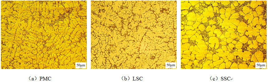圖1:拉伸試樣示意圖 2、試驗結果 2.1 對顯微組織的影響 圖2為PMC、LSC、SSC 3種鑄造方式所得試樣的顯微組織。合金組織主要為初生α-Al及共晶Si相。從圖2a中看出,α-Al相呈較為粗大的樹枝晶,取向無明顯規律,且由于α-Al相晶粒尺寸粗大,分布雜亂,其晶界處析出的共晶Si相也存在明顯的偏析集聚現象。從圖2b看出,α-Al相較PMC明顯細小,呈薔薇狀或等軸晶。組織更加致密,排布更加均勻。但晶間析出相的偏析現象未能消除。從圖2c看出,由于初生α-Al相是經過半固態制得,凝固時從薔薇狀逐漸演化成形狀較為圓整的類球狀,氣孔、縮孔等鑄造缺陷和微觀偏析現象明顯減少,晶粒最為圓整,組織最為均勻。