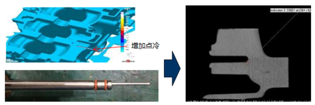 圖3:加工后發現孔內有較大縮孔,增加預鑄孔后縮孔得到有效解決。 產品設計以及后續的模具設計不可能達到完美,同時由于邊界條件設置的局限性也無法模擬出實際的鑄造過程,因此很多缺陷很難在產品設計時做到完全預防,問題往往在批量生產過程中暴露。但在不影響最終產品結構、功能的前提下可對產品或者模具進行適當優化。 增加預鑄孔是解決縮孔的一個比較常用的方案,但在增加預鑄孔時需要重點考慮孔的直徑、深度以及位置度、起模斜度控制,一旦出現型芯變形必須進行更換,同時對型芯進行表面處理以增加型芯強度。 針對粘模、拉傷,主要集中在模具溫度較高的一些凸起(對應零件為凹槽)和起模斜度較小的位置以及鋁液直接沖刷區域,在開模時模具將零件表面拉傷,因此在結構上可在不影響壁厚的前提下適當增大模具凸起位置圓角,以及適當增大起模斜度,或者對模具表面采取被覆處理使脫模劑更多的附著在模具表面以減小拉傷、粘模風險。 2.3 工藝方案制定 某缸體在發動機測試時出現機油泄漏,漏點為靠近油道的螺紋孔,對缺陷件進行CT掃描,發現螺紋孔底部存在縮松,見圖4。該位置已增加預鑄孔,但對模溫進行測量,溫度仍較高。最后新增了高壓點冷,模具溫度得到控制,縮孔問題得到明顯改善,見圖5。