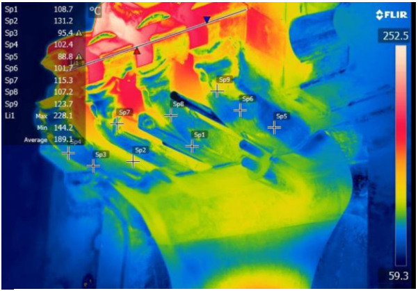 圖6 使用局部擠壓,該位置試漏不良率得到明顯改善 好的工藝方案同樣對降低縮孔比例以及降低鑄件表面粘模、拉傷有著很大的作用。有時通過單純的增加預鑄孔不一定能解決內部縮孔的問題,這時候需要運用點冷,即在模具或者型芯內部增加冷卻循環通道。點冷分為普通點冷和高壓點冷,兩者的選用仍需通過模具溫度來確定,如果模具溫度較高,選擇高壓點冷可迅速將熱量帶走,這種工藝方案非常實用,也在很多壓鑄廠成功應用。同時需要定期檢查和更換型芯,避免型芯變形、漏水等帶來其他質量問題。 目前在壓鑄件的重點位置采用局部擠壓工藝的運用越來越廣泛,局部擠壓使內部鑄造質量更加致密,因此產生縮孔、縮松的比例更低。在局部擠壓過程中重點需要控制擠壓的起始時間、擠壓銷的噴涂(避免擠壓銷卡滯),同時對擠壓深度也應進行監控。 除了上述方案外,模具表面處理、冷卻水類型、噴涂方式、噴涂時間、噴涂角度、噴涂距離和噴涂路徑等都需要進行重點考慮。如冷卻水,對于一些要求較高的鑄件,很多壓鑄廠采用純凈水進行冷卻,避免冷卻通道結垢,從而減小冷卻流量,導致模具溫度達不到要求。針對噴涂的工藝設置,現在仿形噴涂得到越來越多的運用,同時對噴嘴位置的定期校準也很必要。總的來說,工藝參數的制定對壓鑄件質量影響很大,需要通過大量的試驗和經驗進行驗證,同時也是一個持續優化的過程。 2.4 過程控制 過程控制的主要目的是確保相關參數在已制定工藝方案的規定下得到穩定的實施。模具溫度的監控尤為重要,目前使用熱電偶可對模具溫度實時監控,但由于不能覆蓋所有的位置,因此使用熱成像儀或者測溫槍對模具溫度進行定期的測量十分必要。熱成像儀除了用于具體問題分析外,在模具溫度參數制定時進行連續的溫度測量非常重要(見圖7)。