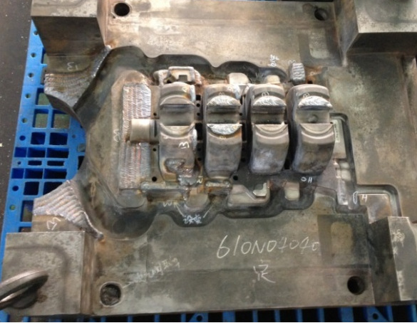 ![]() 摘要:敘述了某壓鑄模具定模芯的燒蝕、裂紋、粘鋁等失效情況,并分析了形成原因。修模處理分為標記、焊接、數(shù)控銑和電火花加工等工藝過程,所修復(fù)模具的質(zhì)量滿足技術(shù)要求。同時,探討了提高壓鑄模具使用壽命的措施,包括模具結(jié)構(gòu)設(shè)計合理、模具材料選擇正確、熱處理工藝優(yōu)化、使用環(huán)境恰當以及維修保養(yǎng)規(guī)范。 壓鑄模具由于長時間處于高溫、高壓、高速的工作環(huán)境下,模具表面產(chǎn)生周期性的應(yīng)力和應(yīng)變,使用一定時期以后就會出現(xiàn)龜裂、燒蝕、裂紋等損壞情況,導(dǎo)致模具不能繼續(xù)使用,只有經(jīng)過修理之后,才能繼續(xù)投入生產(chǎn)。因此,在壓鑄模具使用過程中,修模非常重要,既能保證生產(chǎn)出合格的產(chǎn)品,又能延長模具的使用壽命。 1、失效形式及原因 圖1為某鋁合金缸體的壓鑄模具定模芯,其材質(zhì)是H13鋼,在生產(chǎn)中出現(xiàn)失效情況,其失效形式及原因分析如下。