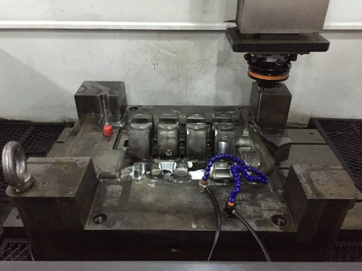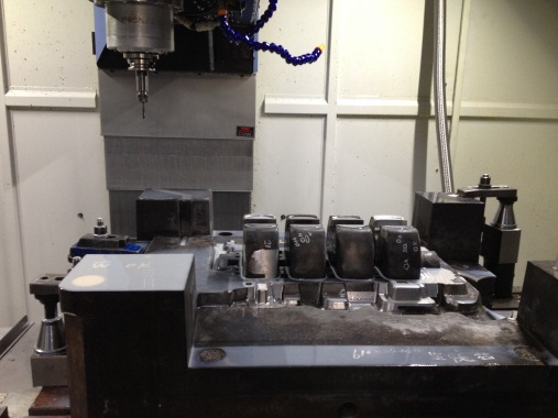圖2:氬弧焊接 2.3 數(shù)控銑 補焊的區(qū)域需要經(jīng)過機械加工去除多余材料,將定模芯模型文件在UG NX軟件中打開,分別進行粗加工、精加工數(shù)控編程,后處理產(chǎn)生程序文件,傳輸程序到機床中。把定模芯吊裝到機床工作臺上,打表找正,壓緊固定。按照程序單要求精確對刀,設(shè)定加工坐標系G54,調(diào)出粗加工程序,設(shè)置加工參數(shù),啟動加工。調(diào)出精加工程序,設(shè)置加工參數(shù),啟動加工,見圖3。