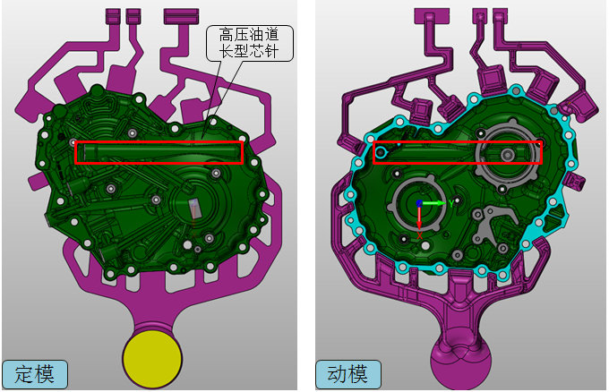 ![]() 原標(biāo)題:鋁合金壓鑄過程中減少長抽芯針變形和偏擺研究 摘要:針對變速箱側(cè)蓋深高壓油道孔壓鑄成型過程長抽芯針變形和偏擺問題,研究了壓鑄工藝、模具結(jié)構(gòu)和抽芯針的材料對其變形和偏擺的影響。結(jié)果表明,澆注方案和關(guān)鍵工藝參數(shù)選擇對減少長抽芯針變形和偏擺非常重要。長抽芯針定位穩(wěn)定性、針與針套分段式配合結(jié)構(gòu)、高壓冷卻結(jié)構(gòu)均可降低長抽芯針變形和偏擺的可能性。高強(qiáng)度材料的長抽芯針可降低長抽芯針變形和偏擺的可能性。 隨著汽車行業(yè)的快速發(fā)展和節(jié)能環(huán)保形勢要求,汽車鋁合金輕量化實(shí)現(xiàn)了飛速發(fā)展。因此,高精密壓鑄鋁合金鑄件需求量越來越大,所要求的產(chǎn)品品質(zhì)也越來越高。壓鑄鋁合金缸體、閥體、殼體、變速箱側(cè)蓋等鑄件均設(shè)計(jì)大量高壓油道孔。針對致密性要求高的高壓油道孔,傾向于采用壓鑄毛坯一次成形,需要設(shè)計(jì)長抽芯針。而在壓鑄成形過程中,長抽芯針容易出現(xiàn)變形和偏擺問題。鋁合金壓鑄件在壓鑄成形過程中導(dǎo)致長抽芯針發(fā)生變形和偏擺的原因很多,但目前針對此問題的報(bào)道較少。 本課題結(jié)合了我司高精密壓鑄鋁合金鑄件變速箱側(cè)蓋的實(shí)際生產(chǎn)情況:深高壓油道孔(長度大于250 mm)采用壓鑄毛坯一次成形,無需再進(jìn)行機(jī)加工。為了減少長高壓油道對應(yīng)的長抽芯針在壓鑄生產(chǎn)過程中的變形和偏擺,針對高精密壓鑄鋁合金鑄件變速箱側(cè)蓋的壓鑄生產(chǎn)工藝、模具結(jié)構(gòu)、長抽芯針材料性能進(jìn)行了研究,并提出了改進(jìn)措施。 1、壓鑄生產(chǎn)工藝 高精密壓鑄鋁合金鑄件變速箱側(cè)蓋,鑄件質(zhì)量為3.26 kg,材質(zhì)為ADC12鋁合金,外輪廓尺寸為404 mm×304 mm×100 mm,澆注質(zhì)量為6.1 kg,其中高壓油道孔長為262 mm,直徑為φ10 mm,整個(gè)油道壁厚要求大于3.5 mm,油道在298 kPa的空氣壓力下,泄漏量小于0.81 mL/min。在壓鑄生產(chǎn)過程中,澆注系統(tǒng)設(shè)計(jì)、關(guān)鍵壓鑄工藝參數(shù)選擇等,對高壓油道孔對應(yīng)的長抽芯針變形和偏擺都存在影響。 1.1澆注系統(tǒng)設(shè)計(jì) 澆注系統(tǒng)的設(shè)計(jì)對金屬液在模具內(nèi)流動(dòng)的方向與狀態(tài)、模具的壓力傳遞等起到重要的控制作用,并且能調(diào)節(jié)填充速度、填充時(shí)間和模具的溫度分布等填充型腔的工藝條件。通過對此變速箱側(cè)蓋進(jìn)行模流分析確定最優(yōu)澆注系統(tǒng)方案為多點(diǎn)進(jìn)澆方式(見圖1)。