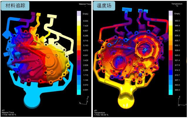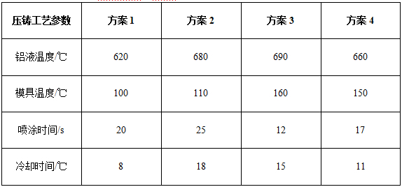 圖2 模流分析 模流分析結(jié)果表明:①按照以上澆注方案,高壓油道長抽芯針在壓鑄成形過程中受到幾股鋁液同時(shí)的沖擊作用。根據(jù)受力平衡,只要此長抽芯針定位足夠穩(wěn)定,強(qiáng)度足夠高,可以避免在壓鑄成形過程中由于鋁液對其沖擊而導(dǎo)致的變形和偏擺。②從填充率為100%的溫度場可以看出,高壓油道長抽芯針?biāo)軠囟确植急容^均勻,溫度梯度不明顯。同時(shí)生產(chǎn)過程中還可以通過調(diào)節(jié)鋁液溫度、模具溫度、噴涂時(shí)間、冷卻時(shí)間來削弱溫度場對高壓油道長抽芯針變形和偏擺影響。 1.2 壓鑄工藝參數(shù)選擇 壓鑄工藝參數(shù)對鑄件品質(zhì)非常重要,其中溫度對高壓油道長抽芯針影響最大。當(dāng)溫度過低時(shí),高壓油道長抽芯針?biāo)軆?nèi)外溫差大,鋁液就會(huì)對其產(chǎn)生強(qiáng)烈的沖擊,受到?jīng)_擊后很容易變形、開裂受損。當(dāng)有高溫的鋁液注入時(shí),長抽芯針的溫度會(huì)迅速上升,進(jìn)行冷卻時(shí),此處鋁液冷卻速度緩慢,導(dǎo)致鑄件會(huì)有縮孔、縮松等缺陷出現(xiàn),使鑄件質(zhì)量受到嚴(yán)重的影響。因此控制好高壓油道長抽芯針溫度不僅影響鑄件品質(zhì),而且對其變形和偏擺也有影響。其他條件控制不變,通過調(diào)節(jié)鋁液溫度、模具溫度、噴涂時(shí)間、冷卻時(shí)間來看鑄件內(nèi)部質(zhì)量以及高壓油道長抽芯針表面燒傷粘鋁。