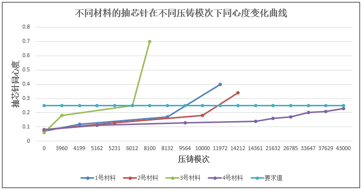 圖5 長抽芯高壓點(diǎn)冷冷卻結(jié)構(gòu) 3、抽芯針材料 不同材料的抽芯針強(qiáng)度不一樣。選用不同材料的抽芯針,在其他條件保持不變的情況下,進(jìn)行壓鑄驗(yàn)證,記錄并跟蹤抽芯針壓鑄一定模次之后抽芯針的同心度變化情況(見圖6)。1號材料為熱作模具鋼,硬度為HRC 40~50,材料屈服強(qiáng)度為490~685 MPa,抗拉強(qiáng)度為685~985 MPa;2號材料是在1號材料上進(jìn)行改良,保留了1號材料的優(yōu)點(diǎn),并且得到更好的耐熱裂紋性;3號材料為高速鋼,硬度≥56HRC;4號為特殊熱作模具鋼,硬度為52~57HRC,高硬度,高韌性和極高熱穩(wěn)定性。隨著壓鑄模次增加,從同心度的變化可以看出,1號材料、2號材料、3號材料的抽芯針在壓鑄模次未達(dá)到1.5萬就出現(xiàn)抽芯針同心度大于所要求值0.25。4號材料的抽芯針的同心度隨著壓鑄模次增加穩(wěn)定較好,且壓鑄模次達(dá)到4.3萬模次,同心度仍小于所有要求值0.25。說明4號材料的抽芯針在其壓鑄過程中變形較小。為了更好杜絕長抽芯針變形,選用4號材料的抽芯針,同時(shí)抽芯針壽命收嚴(yán)至3萬模次管控,且每次上模壓鑄前均需要打表測量抽芯針的同心度。