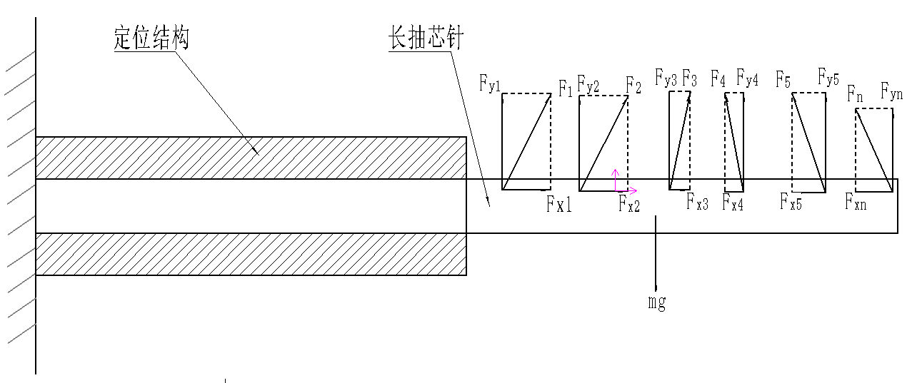 圖6 不同材料的抽芯針在不同模次下針同心度變化曲線圖 可以建立簡單數(shù)學(xué)模型(見圖7),可以看出,如抽芯針模具結(jié)構(gòu)足夠穩(wěn)定的情況下,x方向的分解的力與所受模具結(jié)構(gòu)反作用力的合力為0,抽芯針僅受y方向力的影響。模具結(jié)構(gòu)的穩(wěn)定性影響x方向的受力。y方向的受力不僅受壓鑄生產(chǎn)工藝影響,而且受抽芯針本身材料強(qiáng)度的影響。因此為了減少生產(chǎn)過程中鋁液對抽芯針的沖擊力F1,F(xiàn)2,F(xiàn)3…,F(xiàn)N而導(dǎo)致抽芯針的變形和偏擺影響。