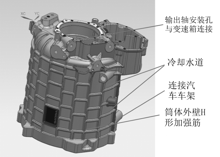 驅動電機殼體如圖1所示,由四個功能區組成:一是安裝電機內殼、定子和轉子