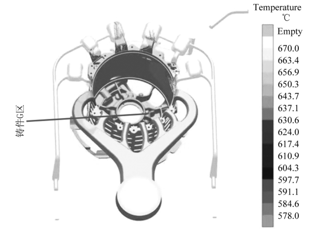 圖1 電機殼體模型 為了減輕電機重量,提高電動汽車的續航里程,鑄件結構設計采用有限元分析,將電機殼體筒體部分壁厚減薄到4 mm,增加了“H”形加強筋;輸出軸組件安裝區壁厚由15 mm減薄到6 mm,增加異形加強筋,電機殼體鑄件重量由原來的的15 kg減輕到8 kg。鑄件結構優化設計給壓鑄模具冷卻系統設計和壓鑄工藝參數設計帶來了極大難度,本文主要對壓鑄模具冷卻、溫度智能控制系統、壓鑄工藝參數、殼體鑄件質量和生產效率進行研究。 2、壓鑄模具設計 2.1 冷卻系統 圖2是電機殼體實物圖,孔隙率不大于4%,電機殼體的筒體部分體積較大,長度500 mm,壁厚4 mm,鋁液長距離填充型腔必然導致模具溫度急劇上升,圖3所示的模流仿真溫度場中可以看出,殼體內腔深處結構復雜的加強筋位置G區壁厚最厚,溫度最高,必然產生粘鋁、內部疏松、氣孔或縮孔,高壓點冷卻直水道無法加工。將該處設計成鑲件并采用3D打印冷卻水道,直接與模芯的高壓冷卻水管道連接,可以解決G區冷卻問題。如圖4所示,1是模具鑲件部分的局部實現了隨形冷卻水道,為了冷卻水道到模具型腔外表面的距離,圖1異形結構尖角處只能采用直徑為1 mm的3D打印水道,確保圖3高溫區G的水道外壁到模具表面不足8 mm,實現精準隨形冷卻,確保冷卻水道到模具型腔外表面的距離基本相等,解決了復雜模具表面導熱能力不平衡問題;2為高壓進、出水道,一端與高壓冷卻裝置連接,另一端與車間回水管道連接。