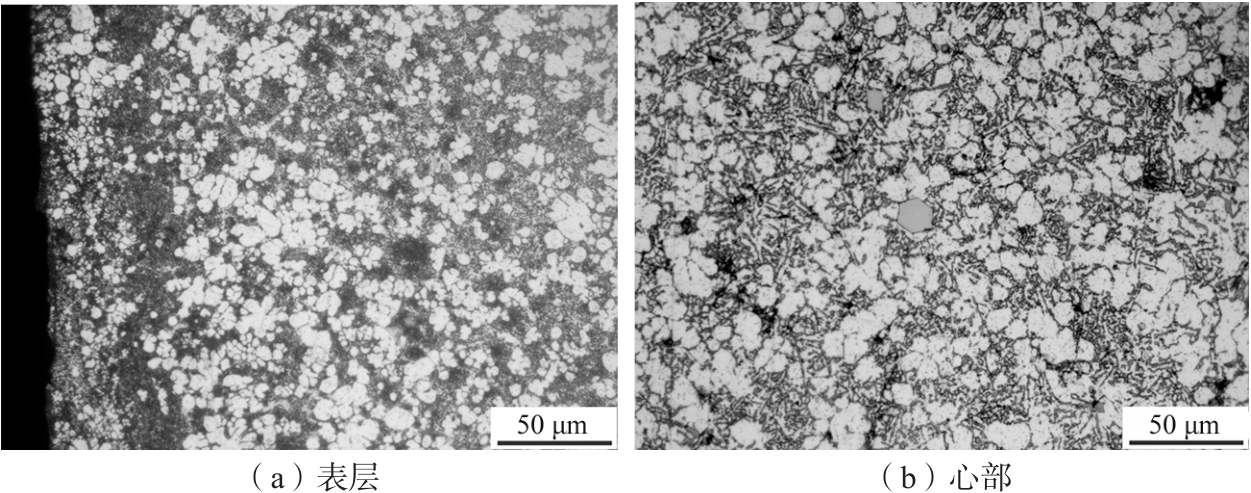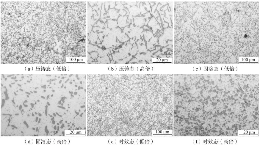 表2 圖4中P點的EDS分析結果 % 3、熱處理對壓鑄組織的影響 圖5對比分析了熱處理前后的鋁合金ZL102壓鑄組織,可以看出,熱處理前后初生α(Al)變化不大,枝晶取向都沒有明顯規律,而硅相的形貌和分布則發生了明顯變化。壓鑄態組織中的硅相呈現針狀/板條狀分布,嚴重割裂了α(Al)基體;經過固溶處理后,組織中的硅相發生了熔斷和球化,長短徑比值下降,硅相球度提高;經過時效處理后,原本固溶階段溶入α(Al)基體的硅元素析出,在α-Al基體上呈現出細密的點狀形態,而晶界的硅相更加圓整,球度進一步提高。對于壓鑄組織中出現的多邊形AiSiFeMn四元金屬間化合物,在固溶與時效處理過程中,其形態并沒有發生明顯變化,推測原因在于本文固溶處理溫度并不足以使其溶入α(Al)基體中。由圖5還可以看出,壓鑄組織中分布有一定數量的氣孔,固溶處理后組織中的氣孔有增大的趨勢,而繼續時效處理氣孔并沒有進一步擴大。