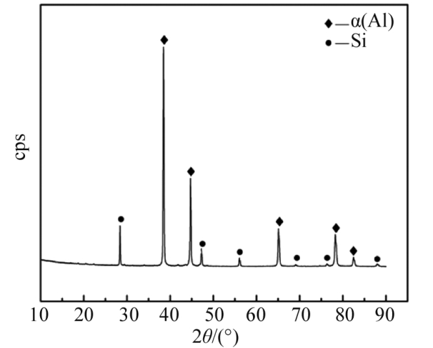 根據熱傳導的物理規律,在進行熱傳導時物體內部的溫度場會隨時間發生變化,這使得直接測量熱導率有一定困難。本文在測量合金的密度、比熱容以及熱擴散系數的基礎上,采用式(1)計算出合金的熱導率 2、鋁合金ZL102壓鑄組織 濾波器殼體由鋁合金ZL102壓鑄而成,由表1得出合金中硅含量為12.8%(質量分數,下同),該成分接近鋁硅二元合金共晶成分(Al-Si二元平衡相圖中共晶成分點Si含量為12.6%),合金凝固時主要發生共晶反應L→α(Al)+β(Si),形成大量的α(Al)+ Si共晶組織。然而,由于壓鑄工藝下合金冷卻速率高,凝固過程遠離平衡態,因此鋁合金ZL102室溫下壓鑄組織中存在的物相包括初生α(Al)、鋁硅共晶組織、初晶硅以及少量的金屬間化合物。如圖2顯示了采用OM得到的壓鑄件表層及心部顯微組織,其中灰白色的基體為初生α(Al),在基體之間分布有大量灰黑相間的鋁硅共晶組織,以及針狀/板條狀的初晶硅。對比圖2a與圖2b,表層組織更加細小均勻,這是由于壓鑄件在成形時表層直接接觸模具型壁,合金冷卻速率高、過冷度大,使得表層組織中晶粒更加細小均勻。此外,壓鑄件心部組織中還發現了少量大塊的灰色多邊形組織,如圖2b所示,由于合金成分中含鐵量稍高,初步判斷其為某含鐵物相。采用X射線衍射(XRD)測試合金物相組成,掃描范圍為10°~90°,掃描速度為4°/min,將測試結果導入MDI Jade 6進行分析,結果如圖3所示。由XRD檢測結果可知,合金中只存在α(Al)與Si相,并未檢測到含鐵金屬間化合物等,造成上述情況的原因可能是合金中金屬間化合物的含量較低,導致XRD并未檢測到。