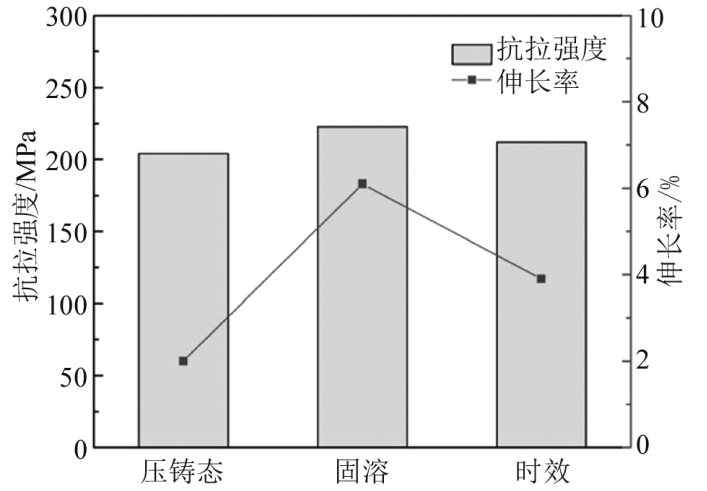 圖5 壓鑄態、固溶及時效組織的對比分析 4、熱處理對力學性能及導熱性能的影響 不同熱處理工藝下的壓鑄鋁合金ZL102力學性能如圖6所示,可以看到,在強度與伸長率方面,固溶處理后的試樣優于壓鑄態及時效處理的試樣,其抗拉強度與伸長率分別為222.8 MPa與6.1%,相比壓鑄態抗拉強度提高了9.2%,伸長率得到明顯改善,提高了205%,而時效態的試樣力學性能居中。分析原因,盡管已有研究認為,由于氣孔的存在普通壓鑄件不適合進行熱處理,且鋁合金ZL102為非熱處理強化合金,但固溶處理過程中硅相的熔斷和球化顯著改善了其對α(Al)基體的割裂作用,減少了合金承載時在周圍產生的應力集中,有利于合金強度及伸長率的提高。進一步時效處理,合金力學性能相比固溶態反而發生了一定的下降,其原因在于α(Al)晶界及固溶體中析出的硅相進一步聚集長大發生粗化現象,損害了合金的力學性能,且合金時效過程中并沒有析出時效強化相。