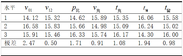 表7 信噪比響應(yīng) 從圖4可以得出,P比與試驗均值呈正相關(guān)且為線性關(guān)系,即隨著P比的增加,試驗均值也顯著增加。這是因為,高的P比能推動金屬液基本充滿型腔,同時高的比壓會使金屬的內(nèi)部組織更為細(xì)密,從而使鑄件的質(zhì)量有顯著提高;但是P比太大會出現(xiàn)跑鋁、損壞模具甚至壓鑄機的現(xiàn)象,所以實際生產(chǎn)中,P比盡量選取中間值。另外,V01對試驗均值的響應(yīng)曲線,變化較大,當(dāng)V01從低到高時,會得到外形輪廓清晰度好的鑄件,同時鑄件表面質(zhì)量高;但是,過高的V01會使鋁液在壓室出現(xiàn)卷積現(xiàn)象,造成鑄件表面出現(xiàn)疊皮現(xiàn)象。當(dāng)t增時間長,鋁液已經(jīng)凝固,對于薄壁殼體,會造成殼體表面裂紋。因此,薄壁殼體的t增要做到薄、厚兼顧。時間太短,厚壁處因補縮不足,會出現(xiàn)縮孔、縮松等缺陷;時間過長,會造成薄壁表面開裂。所以,對于體積大,形狀復(fù)雜的殼體薄壁鑄件,t增要選擇適中。而,V12、V充、t充和t留基本是圍繞著試驗均值的中線波動,因此可以理解為這4個因素對試驗均值響應(yīng)影響較小。 通過表6均值響應(yīng)和表7信噪比響應(yīng)可以得出,正交試驗結(jié)果的極差。從表7可以得出,最主要的因素是V01,水平2的工藝參數(shù)對信噪比的響應(yīng)最敏感;其次是t增,水平2的工藝參數(shù)對信噪比的響應(yīng)最敏感;然后是P比,水平3的工藝參數(shù)對信噪比的響應(yīng)最敏感,但是,根據(jù)經(jīng)驗,過高的P比會對模具及設(shè)備造成破壞性影響,因此,推薦P比的工藝參數(shù)也選擇2水平。按照這個方法,針對這三種參數(shù)的響應(yīng)因素,選擇水平為2會得到較好的望大特性。 5、結(jié)論