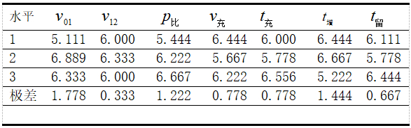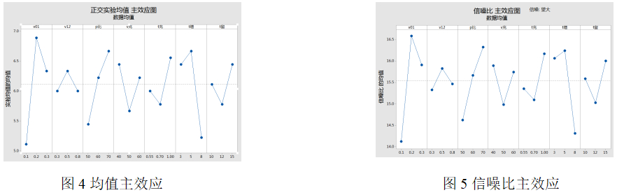 根據(jù)圖4,通過正交計算,可以得出試驗均值響應(yīng)表,詳見表6;根據(jù)圖5,通過正交計算,可以得出試驗信噪比響應(yīng)表,見表7。