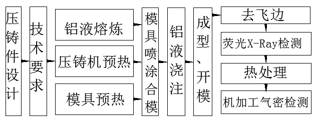 圖2 殼體設(shè)計流程 為了得到合格的薄壁殼體零件,要對殼體毛坯進(jìn)行去飛邊、X射線檢測、紫外線熒光檢測。其中, X射線檢測是為了檢查零部件內(nèi)部縮松、縮孔等缺陷;紫外線熒光檢測,是檢查殼體表面的微小鑄造裂紋;由于殼體屬于功能性裝配件,還有氣密性檢測要求,所以需要對殼體進(jìn)行泄漏檢測,保證殼體工作時,流通的高溫氣體不泄露,可以快速建立起壓力。根據(jù)薄壁殼體的投影面積,選擇合模力為3 500 kN的力勁冷壓室壓鑄機。 1.1.1 殼體鑄造過程關(guān)鍵工藝