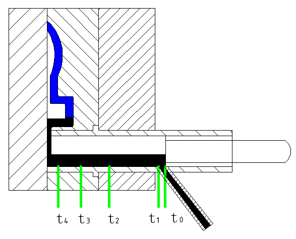 圖3 壓鑄機壓射過程示意圖 圖3為壓鑄機壓射過程示意圖。影響薄壁殼體質(zhì)量的關(guān)鍵參數(shù)有速度、壓力及時間。慢速壓射速度,由t0-t1和t1-t2兩段組成,用V01及V12表示;高速轉(zhuǎn)換點t2開始位置(壓鑄最重要的參數(shù)),高速壓射區(qū)間為L2(t2-t3);V充為填充速度;P比為增壓比壓。t充、t增和t留為填充時間、增壓時間和留模時間。 實際使用的壓鑄主要工藝參數(shù)見表2。