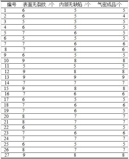 針對速度、比壓、時間等關(guān)鍵參數(shù),采用正交試驗,以獲得優(yōu)化的工藝參數(shù)。 4、試驗結(jié)果與分析 為了獲得準(zhǔn)確可靠的數(shù)據(jù),按照試驗工藝,每一組壓鑄10件薄壁殼體,通過田口DOE計算,獲得壓鑄A380合金殼體的最優(yōu)工藝參數(shù)。 優(yōu)化目標(biāo)是表面質(zhì)量、內(nèi)部缺陷及氣密性。根據(jù)試驗及檢測結(jié)果,得到的數(shù)據(jù)見表5。對所有數(shù)據(jù),輸入到Minitab軟件的設(shè)計表中,按照實驗條件與結(jié)果之間的關(guān)系,通過軟件自動獲得各個影響因素對結(jié)果的均值曲線,并根據(jù)均值曲線進(jìn)行科學(xué)分析,獲得最優(yōu)參數(shù)。