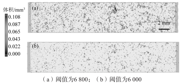 圖3 15號試樣中孔洞的CT形貌(A區域) 由于工業CT是使用X射線對樣品進行掃描后,再通過VGstudio軟件進行三維重構,因此軟件的后處理對CT結果的準確性有著重要影響。后處理軟件中的參數閾值對后處理的結果有著直接影響,選取不同的閾值,會得到不同的結果,如圖4所示(所掃描區域中灰度值大于閾值的部分被認為是材料,而低于閾值的部分被認為是孔洞,即圖4中的A區域)。同一個樣品,當選取閾值為6800和6000時,樣品所得的CT后處理結果差異明顯,圖4a中,樣品含有大孔洞與小孔洞混合,而圖4b中,樣品沒有大孔洞且分布均勻??梢?,閾值對CT后處理結果有顯著影響。