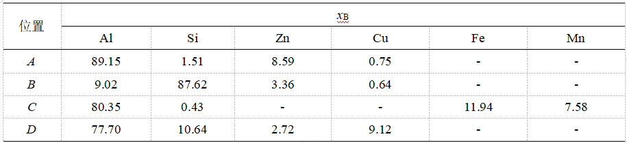 圖7 不同Zn含量鋁合金的XRD圖 圖8為不同Zn含量的Al-Zn合金SEM形貌,其中A處白色點狀相為在晶界處未溶解的富Zn相。可以看出,由于Zn在Al中極限溶解度可達32.8%,合金凝固過程中較多的Zn溶解進基體中,且由于該位置在Al基體附近,因此EDS結果中主要元素含量為Al,Zn含量較低。B處灰色塊狀為初生Si相,C處呈漢字狀的為Al6(FeMn)相。由于Fe、Mn含量較低,并且形成較少為漢字狀Al6(FeMn)相,不會對組織產生割裂作用,因此對合金的力學性能影響較小。D處灰白色短棒狀為Al2Cu相。隨著Zn含量的增加,第二相粒子的形貌、數量以及尺寸變化不明顯。可見,Zn含量的提高對于合金中第二相粒子影響不大,此結果也與XRD結果相符合。