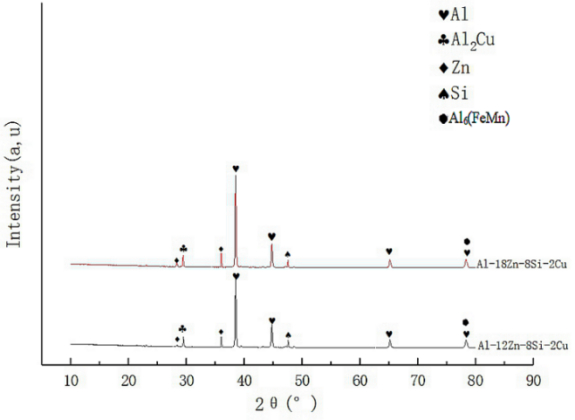 圖6 Al-xZn-8Si-2Cu合金的金相組織 2.5 XRD及EDS物相分析 圖7為不同Zn含量的Al-Zn合金XRD圖。可以看出,Al-xZn-8Si-2Cu合金主要由Al、Al2Cu、Zn、Si、Al6(FeMn)等5種相組成。隨著Zn含量的提高,Zn含量的變化對合金的相組成沒有影響,且不含Zn的相的峰值以及位置未發生變化,而含Zn相的峰值有所提高,峰強度增加。