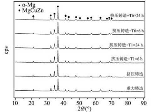 圖3 不同工藝狀態Mg-5Zn-2.5Cu-0.4Zr合金XRD圖 圖2 a、b分別是人工時效6 h和24 h后合金的微觀組織圖像,同鑄態的組織相比沒有明顯的變化,這是因為T1熱處理沒有經過固溶處理,再析出的合金元素與第二相有限,因此幾乎觀察不到組織變化。 圖2c、d分別是固溶+時效6 h和24 h后合金的微觀組織圖像,其中圖2d右上角是時效后第二相顆粒的形貌圖像??梢钥吹?,網狀的第二相已經消失,取而代之的是呈項鏈狀分布的顆粒第二相,且時效時間越久,顆粒狀第二相析出越多。不同時效時間處理后合金的XRD圖譜表明,時效處理并沒有改變第二相,析出的顆粒狀第二相仍是MgCuZn相。