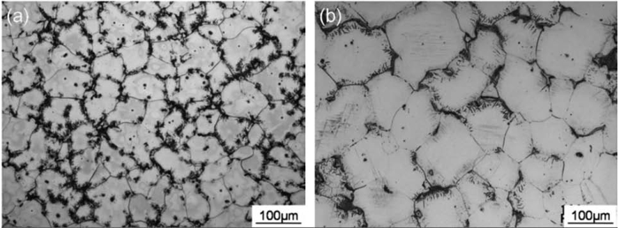 表1 WE43鎂合金機匣低壓熔模鑄造工藝參數 熔模鑄造的蠟模使用模料為中溫石蠟,先用壓蠟機在鋁合金壓型中制備出鑄件各個部位的蠟模,隨后采用手工粘結的方式將蠟模組裝成完整的模組,并對模組進行檢查、矯形、修補,保證尺寸的精確性。接著開始制備型殼。型殼涂料是由320目的剛玉粉和硅溶膠粘結劑配制而成,面層掛砂材料為320目的剛玉粉和100目的剛玉砂,第二層掛砂材料為320目剛玉粉和46目的剛玉砂,背層掛砂材料為320目的鋁礬土粉和24目的煤矸石砂。最后將制備好的型殼放入焙燒爐中,在900 ℃下焙燒。焙燒工藝過程為升溫3 h,保溫2 h,隨爐冷卻12 h,以除去型殼中的殘余蠟料、有機物及水分。 采用應變誘發熔化激活法制備GW94K觸變成形用半固態漿料。鑄錠經500 ℃×8 h均勻化處理后,擠壓加工成30 mm棒材作半固態坯料,擠壓溫度為440 ℃,擠壓速度為 Φ 0.15 m/min,擠壓比為11.1。從擠壓棒材上切取約 Φ 26 mm×60 mm 圓柱樣品,在立式電阻爐加熱至給定半固態溫度,保溫5 min后,在一定壓力下將半固態漿料充型至預熱到200~300 ℃的模具中。 2、鑄造成形方法 目前,鑄造是鎂合金結構零部件的主要成形方法,鑄件約占鎂合金構件的90%,而鑄造成形方法會顯著影響材料的組織與力學性能。對比研究了金屬型鑄造和砂型鑄造WE54(Mg-5Y-2Nd-2Gd-0.5Zr,質量分數,以下同)鎂合金的組織與力學性能,結果表明兩種成形方法鑄造的WE54合金具有相似的鑄態組織,如圖1所示,都是由等軸晶及沿晶界不連續分布的少量第二相組成。但是由于砂型鑄造的冷卻速度較慢,WE54鎂合金的組織更加粗大,力學性能低于金屬型鑄造。采用截線法可以確定金屬型鑄造WE54合金的平均晶粒尺寸約為92 μm,而砂型鑄造WE54合金的平均晶粒尺寸約為150 μm。金屬型鑄造和砂型鑄造樣品在峰值時效狀態下的抗拉強度分別為327 MPa和261 MPa,屈服強度分別為234 MPa和209 MPa。
