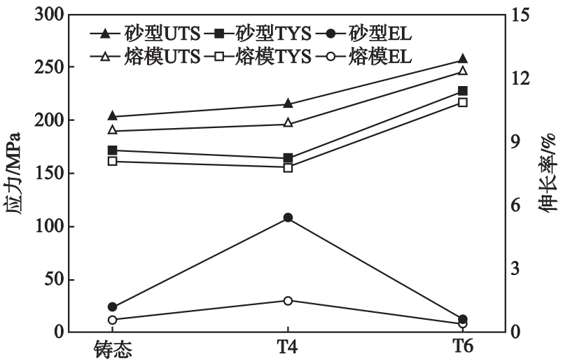 圖2 砂型鑄造和熔模鑄造WE43合金力學性能