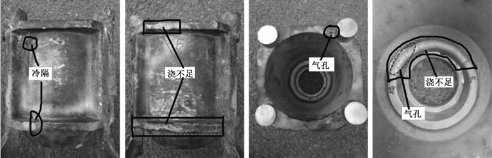 圖3 重力熔模鑄造WE43鎂合金機匣鑄件表觀缺陷