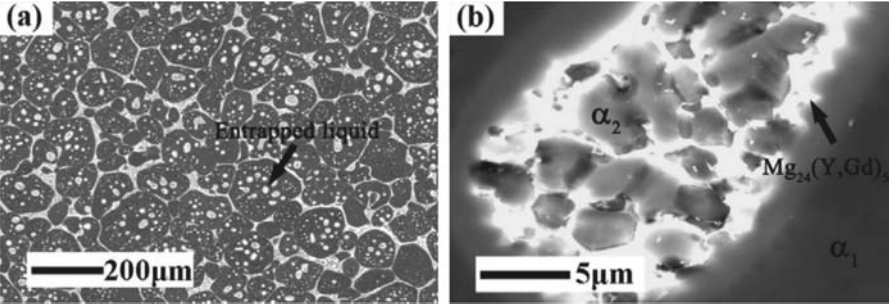 圖4 低壓熔模鑄造WE43鎂合金機匣外觀 另外,我們也研究了GW系列稀土鎂合金的半固態成形性能。半固態成形是指合金處于固液兩相溫度區間內進行鑄造(或鍛造)的一種近凈成形工藝,具有充型溫度低、鑄件缺陷少、材料組織均勻和力學性能優異等優點,已經成為工業上可供選擇的重要的成形方法。半固態成形方法主要有兩種,分別為流變成形和觸變成形,其中觸變成形是將固相坯料重新加熱到半固態溫度區間進行壓鑄或者注射成形。合金在給定溫度下的液相分數是半固態觸變成形過程中的重要冶金參數,觸變成形工藝要求半固態合金的液相分數在成形溫度區間內隨溫度的變化不能過于劇烈,一般認為0.3~0.5的液相分數是觸變工藝最佳的成形溫度區間。 從熱力學相圖計算得到的半固態成形冶金參數來看,Mg-Gd-Y系合金在較寬的成分范圍內都具有較好的觸變成形潛力。其中,GW94K(Mg-9Gd-4Y-0.5Zr)鎂合金是潛在的適合半固態觸變成形合金,且其觸變成形性能優于AZ91鎂合金和A356鋁合金。GW94K鎂合金的成形溫度窗口為577~602 ℃,在此溫度區間合金的液相分數的溫度敏感系數低于0.015 ℃﹣¹。 此外,試驗對比研究了金屬型鑄造和半固態觸變成形GW94K鎂合金的顯微組織與力學性能。金屬型GW94K鎂合金主要由α-Mg基體和分布于晶界上不連續的網絡狀第二相Mg 24(Gd,Y)5 組成,同時,組織中存在疏松缺陷。觸變成形GW94K鎂合金的組織由初始α-Mg及均勻分布的細小二次α-Mg和共晶Mg 24(Gd,Y)5相組成,其掃描電子形貌特征如圖5所示。半固態觸變成形可以顯著提高該合金的力學性能,尤其是塑性性能,室溫下固溶態的屈服強度、抗拉強度和伸長率分別為148 MPa、228 MPa和17.6%,而金屬型鑄件室溫下固溶態的屈服強度、抗拉強度和伸長率分別為124 MPa、200 MPa和5.3%,力學性能提高主要歸因于疏松的消失以及細小脆性相Mg 24(Gd,Y)5 的均勻分布。