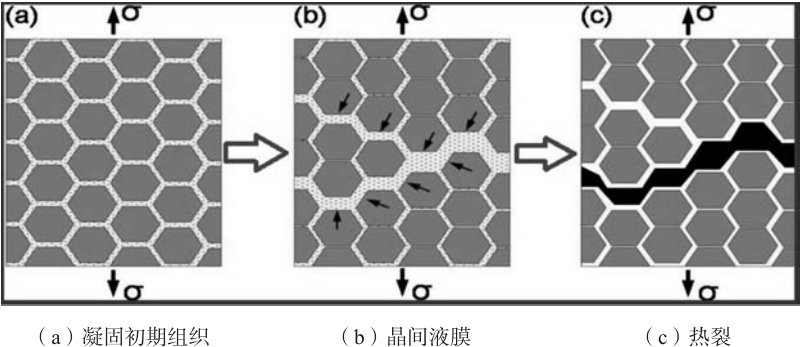 圖5 觸變成形GW94合金的SEM組織 3、鑄造缺陷 對于大型復雜鑄件,采用上述鑄造成形方法都不可避免會產生鑄造缺陷,其中熱裂和疏松是鎂合金中常見的兩種鑄造缺陷,對其形成機制、預測以及對力學性能影響等方面展開了較為系統的研究。 采用一種改進的“CRC”方法分別研究了含Zr和不含Zr在WE54合金砂型鑄件中熱裂缺陷的形成機理,研究表明鑄件中熱裂缺陷的形成機制為:鑄件熱節處的拉伸變形會引起殘余液相的流動和富集,并在晶間形成液膜,而晶間液膜在足夠大的收縮應力作用下會發生斷裂形成初始熱裂紋,初始熱裂紋繼續擴展會在鑄件中形成熱裂缺陷,圖6為熱裂缺陷形成過程示意圖。