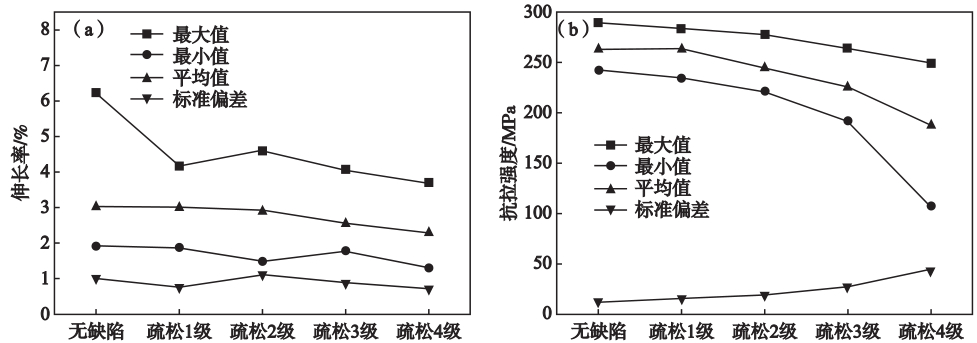 圖7 GW63K鎂合金室溫(a)伸長率和(b)抗拉強度與疏松級別的關系