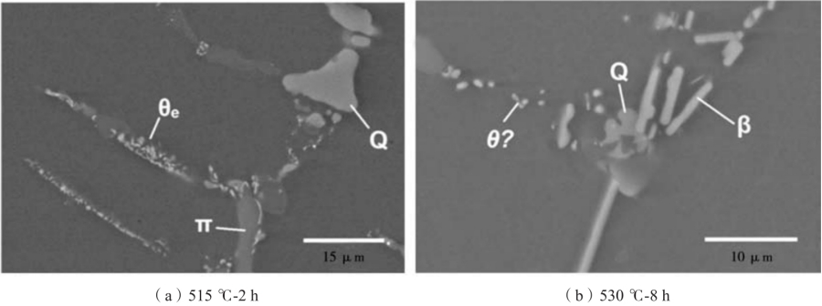 圖5 經過495℃固溶處理2h和6h后合金的金相組織 2.2 第二階段固溶處理工藝優化 第一階段固溶處理在495℃進行6h后,進行第二階段固溶處理,分別在515℃與530℃進行2~8h。如圖6a所示,經過515℃固溶處理2h后,由于共晶和塊狀顆粒的溶解,只剩下少量的Al2Cu相,而隨著固溶處理時間的增加,合金的微觀組織并未發生明顯的變化。從圖6b中可以看出,530℃固溶處理8h后,合金的組織也未發生明顯的變化,組織中π相、β相與Q相仍然存在,說明高溫固溶處理對這幾種相沒有明顯的影響。