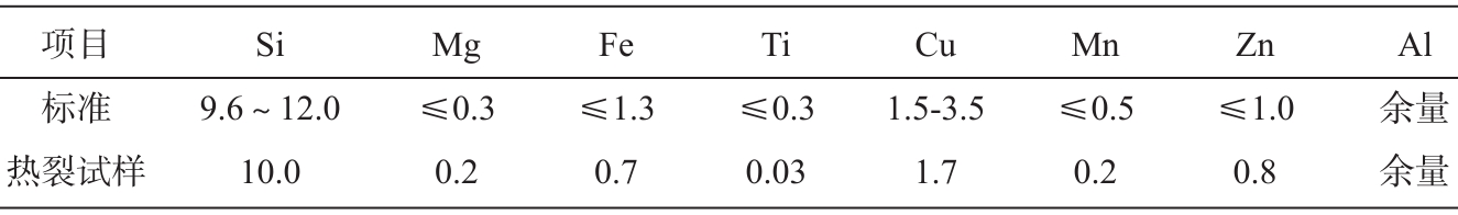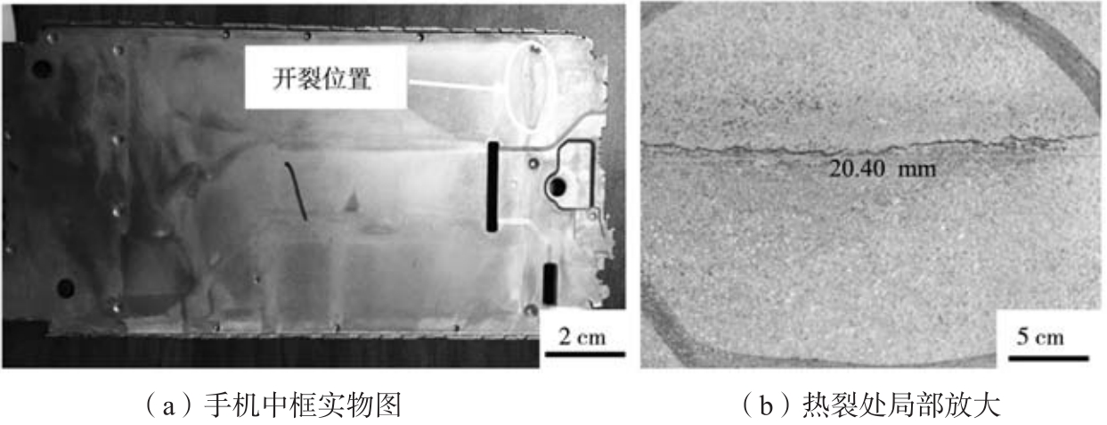 表1 ADC12合金的主要化學成分 wB/% 1.2 壓力鑄造過程 采用的壓鑄機鎖模力為300 kN,料柄厚度15 mm,模具溫度200 ℃,壓射力為330 kN,沖頭直徑為60 mm,壓射壓力116 MPa,壓射時間3.5 s,冷卻時間2.0 s,留模時間8.0 s。本試驗通過模溫機將模具預熱至150 ℃(模具表面實測溫度),然后進行壓鑄。壓鑄過程中模柄的動作行程位置:一快位置為100 mm,二快位置為240 mm,增壓位置為280 mm,跟蹤位置為375 mm。所生產手機中框及其熱裂缺陷宏觀照片如圖1所示,從圖中可以看出,熱裂紋發生在鑄件的熱節處,這是由于在合金凝固末期,金屬液的溫度急速降低,降低了合金液的流速,極易產生縮松及縮孔,降低金屬液對裂紋的補縮效果。
