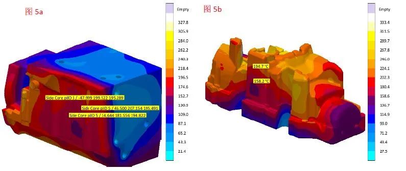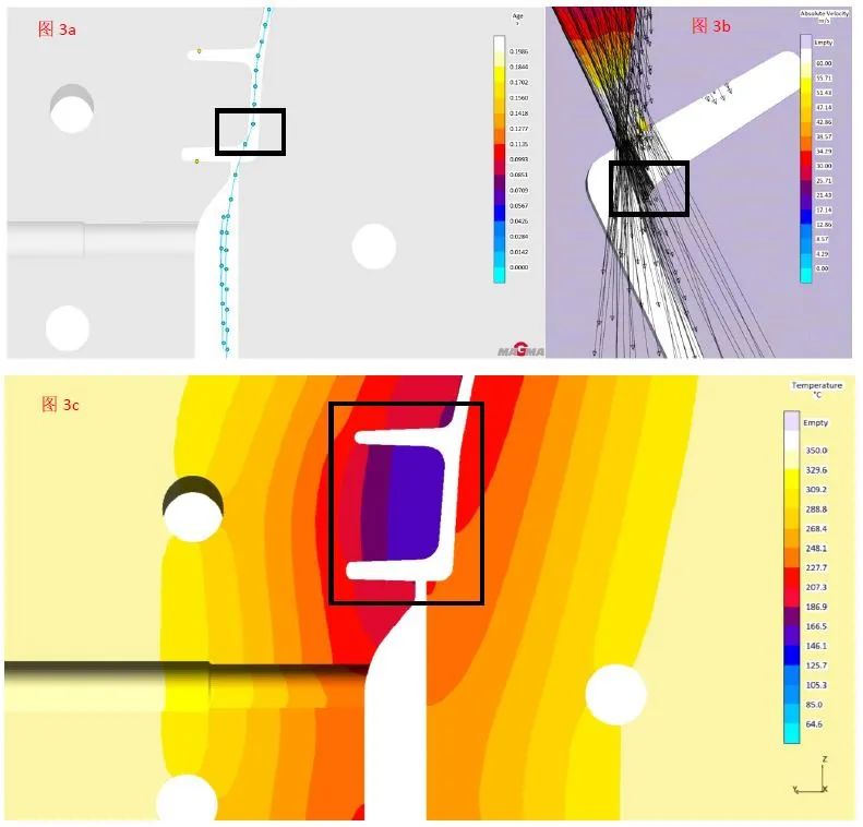 圖4 缺陷圖片 通過觀察模具溫度模擬結果(圖5a)缺陷位置對應的模具呈現表面溫度高,背溫低的狀態,出現了巨大溫度差。