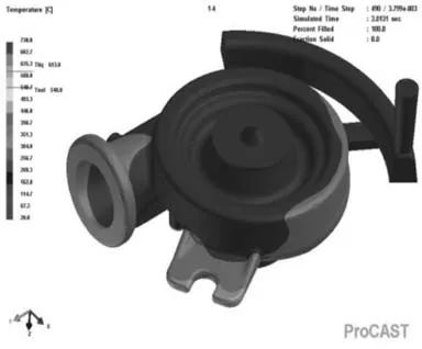 圖5 澆注系統各部分的橫截面及其尺寸 3.鑄造工藝的初步模擬與分析 利用ProCAST軟件對該壓殼鑄件的初步工藝進行了模擬,其充型凝固過程模擬結果如圖6和圖7所示。