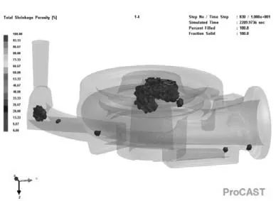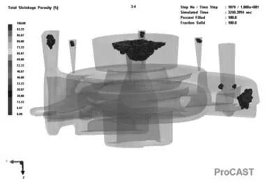 圖8 縮孔、縮松缺陷模擬結果 從圖8中可以看出,除了澆注系統中之外,縮孔、縮松缺陷主要集中在鑄件頂部與靠近中部的厚大部分處,法蘭下部和法蘭后凸臺處也出現少量缺陷。這些缺陷出現的原因主要是這幾處部位均壁厚相對較大且散熱不易。 4.鑄造工藝的優化 根據壓殼鑄件的形狀特點以及上述模擬結果,對鑄造工藝進行了優化,設計了明頂冒口,設置明頂冒口的目的是對鑄件頂部進行補縮,以消除鑄件頂部與靠近中部厚大部分處的縮孔、縮松缺陷。同時,在法蘭頂部添加了1個扁出氣冒口,可以對法蘭部位的液態及凝固收縮進行補縮,而且與法蘭底部放置的一塊半圓形隨形冷鐵相配合,可以調節法蘭部位的溫度場分布,以消除法蘭部位的少量縮孔、縮松缺陷。此外還添加了4個圓形出氣孔,主要是加強型腔內氣體的排出。優化后的鑄造工藝方案如圖9所示。用ProCAST軟件進行模擬,縮孔、縮松缺陷模擬結果如圖10所示。