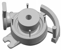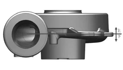 圖1 鑄件的三維模型及輪廓尺寸 該壓殼鑄件的中間部位和垂直法蘭處壁厚相對較大,容易形成熱節,易在凝固過程中形成收縮缺陷,因此,在這兩個位置要添加冒口進行補縮。 2.鑄造工藝方案設計 2.1澆注位置及分型面 首先,確定其澆注位置及分型面。由于采用數字化無模鑄造精密成形機進行造型,因此,在設計其澆注位置及分型面時要考慮機器是否可以將相應的砂型和砂芯銑出。通過查閱鑄造工藝手冊及比較不同澆注位置的優缺點之后,選擇如圖2所示的澆注位置和分型面,其優點是壁厚最大處位于上部有利于實現順序凝固,測量基準面位于下部,易于保證鑄造質量;分型面總體為平面,局部為曲面分型,造型相對簡單,且不存在影響圖紙技術要求的平面(多個面要求不允許存在飛邊、毛刺和凸起)。