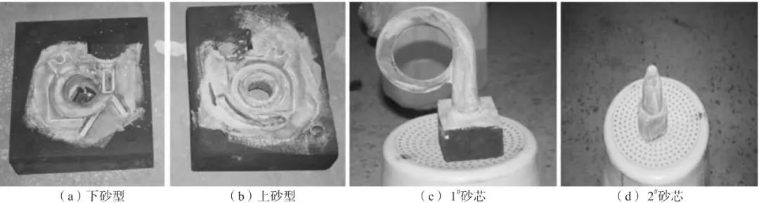 圖10 優化工藝方案的縮孔縮松缺陷模擬結果 從圖10中可以看出,壓殼鑄件本體內縮孔、縮松缺陷全部消除。因此,采用如圖9所示的最終鑄造工藝方案進行生產試制。 5.壓殼鑄件的實際生產 5.1 鑄型的加工處理 采用樹脂砂利用數字化無模精密鑄造成形機(型號為CAMTC-SMM2000)分別進行上型、下型和砂芯的數控加工。利用UG軟件的加工模塊生成砂型和砂芯的加工刀路,其中粗加工選用的刀具為Φ8 mm的平刀;精加工時,選用Φ6 mm的球刀,切削參數中的連接改為沿部件斜進刀,在層與層之間切削。 在加工好后的砂型和砂芯上分別涂刷醇基鋯英粉涂料,刷好涂料的砂型和砂芯如圖11所示。裝配好砂芯的下型如圖12所示。