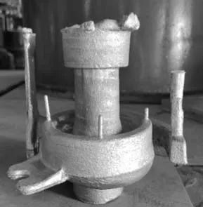 圖12 裝配好砂芯的下型 5.2 鋁合金的熔煉澆注及鑄件的后處理 接 著 進 行 合 型 , 準 備 澆 注 。將 所 需 重 量 的AlSi7Mg0.3(ZL101A)鑄造合金錠放入到坩堝電阻爐中進行加熱熔煉,設定熔煉溫度為750 ℃,澆注溫度為(730±5)℃。采用鋁合金專用除氣除渣劑進行熔體處理,采用Al-5Ti-1B對鋁合金熔體進行變質處理。 鑄件冷卻1 h后進行打箱和落砂處理,用工具將鑄件分型面位置的飛邊毛刺清理掉,最后獲得的鑄件(帶鑄造工藝)如圖13所示。 對鑄件進行了質量檢驗,尺寸符合BS6615/ISO8062及工程標準E3-20的要求,可見,缺陷符合工程規范E4-05-006的要求,化學成分符合《鑄造鋁合金》國家標準規范中的相關質量要求。
