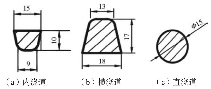 式中:H0 內澆道以上的直澆道高度,cm;h0 內澆道以上的鑄件高度,cm;h為鑄件高度,cm。 經計算得直澆道橫截面積為2 cm²。最終通過計算獲得的澆注系統各部分的橫截面及其尺寸如圖5所示。