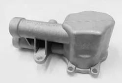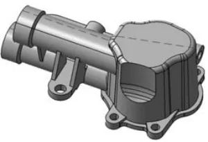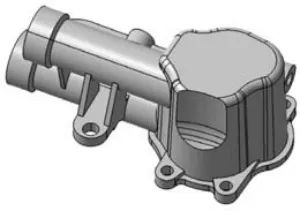 圖11 充型過程和凝固過程的溫度場(chǎng) 可以看出,在充型時(shí),兩股金屬液匯入一起,未出現(xiàn)臺(tái)階面的情況,并且在液面升到上側(cè)的薄壁部分時(shí),金屬液平穩(wěn)上升,未出現(xiàn)紊流、飛濺的現(xiàn)象。在凝固時(shí),除了較遠(yuǎn)處先進(jìn)行凝固之外,由于冷卻系統(tǒng)的加入,出現(xiàn)縮孔的部位在周圍較薄的部位開始凝固之前已經(jīng)開始發(fā)生凝固,在周圍薄壁部分失去補(bǔ)縮能力后。同時(shí),由于加工余量的設(shè)置,加工孔位置厚度增加,導(dǎo)致該處凝固緩慢,對(duì)周圍進(jìn)行補(bǔ)縮。同時(shí),由于左側(cè)澆注位置的改變,在凝固到底部?jī)蓚€(gè)圓筒時(shí),澆注口距離圖7F處預(yù)測(cè)會(huì)產(chǎn)生縮孔位置較近,可以有效的進(jìn)行補(bǔ)縮。 工藝優(yōu)化成形后鑄件的縮松、縮孔分布如圖12所示,可以看出,由于工藝方案的改進(jìn),底部的縮松、縮孔全部轉(zhuǎn)移到了孔加工的部位,其他部位的縮松、縮孔也由于冷卻系統(tǒng)的增加得到了消除。 為進(jìn)一步驗(yàn)證優(yōu)化后的變速器操縱盒工藝方案的可行性,根據(jù)上述優(yōu)化方案對(duì)產(chǎn)品進(jìn)行試制,試制產(chǎn)品如圖13所示,經(jīng)檢驗(yàn),產(chǎn)品整體質(zhì)量較好,內(nèi)外表面無裂紋、縮松、縮孔等缺陷,并且將零件剖開,觀察易產(chǎn)生縮松、縮孔的圖7中的F和G處,也無缺陷產(chǎn)生,與上述模擬結(jié)果相吻合,說明澆注系統(tǒng)和冷卻系統(tǒng)的優(yōu)化設(shè)計(jì)較為合理。