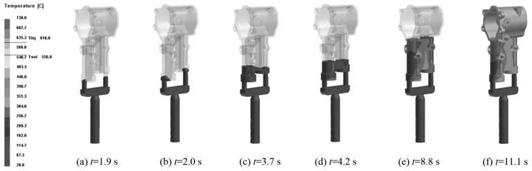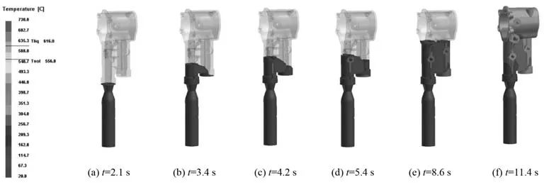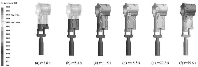 表2 冷卻水管參數(shù) 4.2 方案驗(yàn)證 對(duì)優(yōu)化后的工藝方案進(jìn)行數(shù)值模擬,充型過程和凝固過程的溫度場(chǎng)如圖11所示。