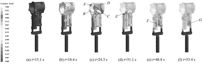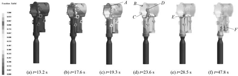 圖5 方案二的充型過程 在進(jìn)行充型時(shí),兩種方案都比較符合一般低壓鑄造的自下而上的填充,但是方案一在充型時(shí)鋁液在壁厚變化較大的部位出現(xiàn)臺(tái)階面,方案二較為合理,但還需再做進(jìn)一步優(yōu)化,且充型都提前完成,因此需要對(duì)壓力曲線進(jìn)行修改。 3.2.2 凝固過程和缺陷的分析 在凝固過程中,金屬液在型腔中逐漸結(jié)晶,形成固液共存的狀態(tài),金屬液存在一個(gè)臨界固相分?jǐn)?shù),當(dāng)超過此臨界值,金屬液流動(dòng)性將變差,以至于失去補(bǔ)縮能力,理論上取臨界固相分?jǐn)?shù)值為0.7。因此對(duì)兩種方案的凝固過程主要分析固相率變化,方案一和方案二的凝固情況分別如圖6和圖7所示。