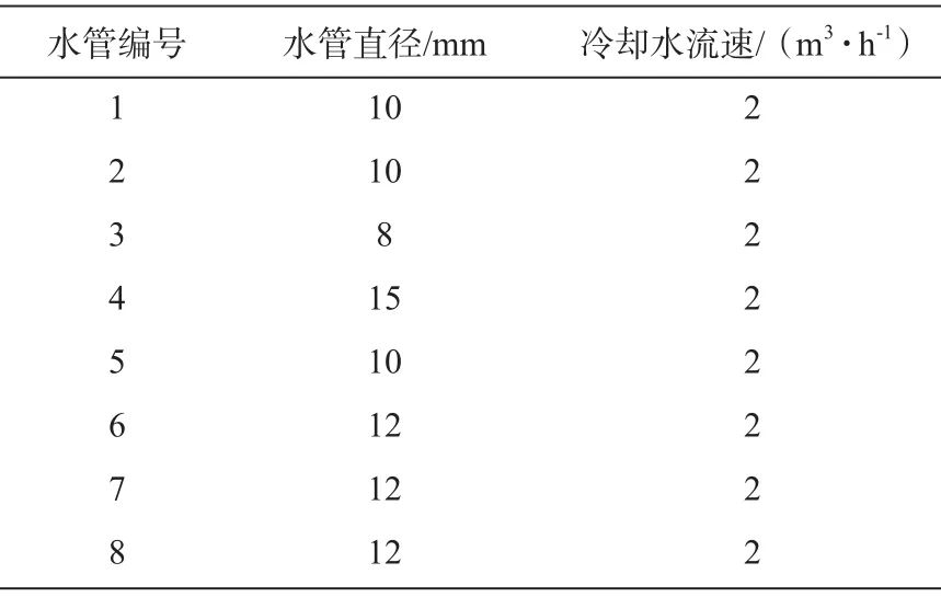 圖8 兩種方案的縮松、縮孔所在位置 4.工藝優(yōu)化 4.1 優(yōu)化方案 綜合比較兩種澆注系統(tǒng),方案二較方案一在充型過程中較為合理且縮松、縮孔體積較小,所以選擇方案二并對(duì)其進(jìn)行進(jìn)一步工藝優(yōu)化。 在充型過程中,針對(duì)在鋁液充型30%的時(shí)候出現(xiàn)的短暫臺(tái)階面,調(diào)整兩個(gè)內(nèi)澆道的截面積,但保證總面積不變,這樣使得充型到該處時(shí)兩側(cè)液面更平穩(wěn),減少因金屬液紊流、飛濺而導(dǎo)致的氣孔、氧化夾渣等缺陷。針對(duì)圖7F處產(chǎn)生的較大縮孔,調(diào)整左側(cè)內(nèi)澆道的位置,這樣澆道位置與出現(xiàn)缺陷的F處較近,便于補(bǔ)縮,改善此處內(nèi)縮孔情況。 由于距離澆口遠(yuǎn)處的薄壁部分厚度較為不均,較厚的部位在凝固之前周邊部位已經(jīng)凝固,無法進(jìn)行補(bǔ)縮,針對(duì)由于此原因產(chǎn)生的縮孔,采用添加冷卻系統(tǒng)的方法,調(diào)整凝固時(shí)溫度場(chǎng)的分布,得到較好的凝固順序。冷卻系統(tǒng)采用水冷的方式,水溫選擇15 ℃。 對(duì)于孔部位的缺陷,由于此處厚度差異較大,因此在此處添加冷卻水管效果不太顯著,因此可以將孔處添加加工余量,將孔填上,后續(xù)再進(jìn)行孔加工,添加的加工余量可以起到補(bǔ)縮的作用,再通過冷卻水管將縮松、縮孔的位置調(diào)整在加工余量范圍內(nèi),后續(xù)孔加工時(shí)進(jìn)行去除。 綜上所述并結(jié)合數(shù)值模擬,優(yōu)化后的澆注系統(tǒng)優(yōu)化結(jié)果和具體的冷卻分布位置如圖9和圖10所示,冷卻水管的參數(shù)如表2所示。