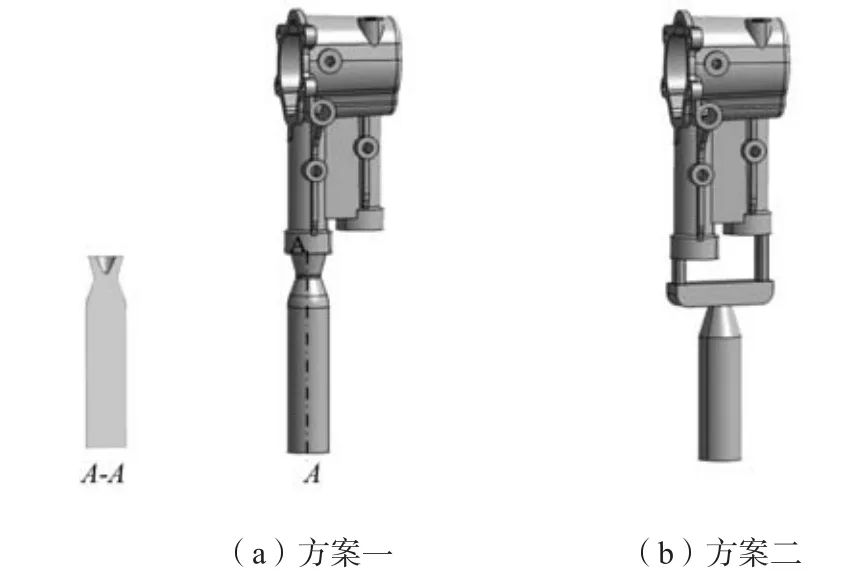 式中:∑A內(nèi) 為內(nèi)澆道的總截面積,G為零件的質(zhì)量,ρ為合金液的密度,v為充填速度,t為充填時(shí)間。合金液密度為2.4 g/m³ ,取充填速度為15 cm/s,t可以通過型腔高度與型腔內(nèi)金屬液升高速度比值確定,由于平均壁厚為4.6 mm,根據(jù)經(jīng)驗(yàn)取充填速度2 cm/s,通過計(jì)算得出內(nèi)澆道的截面積為188 ㎡ 。 根據(jù)常見的澆注系統(tǒng)中組元的截面面積比例關(guān)系可得,∑A內(nèi)∶∑A橫∶∑A直=1.0∶(1.5~1.7)∶(2.0~2.3)。通過經(jīng)驗(yàn)和模擬計(jì)算總結(jié),取∑A內(nèi)∶∑A橫∶∑A直=1.0∶1.7∶2.3。因此本次鋁合金操縱盒低壓鑄造的橫澆道和直澆道的截面積分別為320 ㎡ 和432 ㎡ 。 2.2.2 升液管設(shè)計(jì) 升液管目前多采用鑄鐵材料,但是鑄鐵材料壽命短易腐蝕并且會(huì)導(dǎo)致金屬液增鐵,所以本次使用陶瓷升液管,升液管的高度以升液管底端距坩堝底部距離為基準(zhǔn)設(shè)定。 2.2.3 澆注系統(tǒng)設(shè)計(jì) 低壓鑄造的澆注系統(tǒng)結(jié)構(gòu)必須充分考慮低壓鑄造自下而上的填充順序和自上而下的凝固順序,且通過設(shè)計(jì)底注式澆注系統(tǒng),保證鐵液上升時(shí)充型平穩(wěn),減少因紊流產(chǎn)生的氧化夾渣。本文共提出兩種澆注系統(tǒng)方案,其中方案一為單升液管單澆道,受零件形狀的限制,內(nèi)澆道設(shè)計(jì)成環(huán)狀澆道;方案二為單升液管多澆道,內(nèi)澆道為橢圓形澆道。結(jié)合上述計(jì)算的澆注系統(tǒng)的截面積大小,設(shè)計(jì)出方案一和方案二的澆注系統(tǒng)如圖3所示。