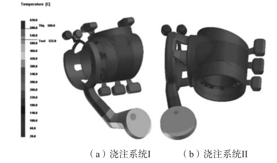 圖6 澆注系統II充型過程示意圖 澆注系統I、II鑄件完全凝固時的溫度場見圖7,可以看出兩種澆注系統鑄件在側壁中間部分溫度較高,其原因是鑄件中間部分內設加強筋,鑄件壁厚較厚,在凝固過程中散熱較慢,易產生熱節,預測此部位會產生縮孔、縮松缺陷。