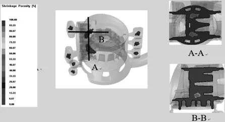 圖12 鑄件實物圖 3.結論 (1)根據殼體的結構,設計了鑄件的兩種澆注系統,并利用ProCAST軟件對其進行數值模擬,結果顯示鑄件在壁厚處產生縮孔、縮松缺陷;內澆口設置在鑄件壁厚較遠的地方產生的縮孔、縮松缺陷較少。分析發現鑄件產生縮孔、縮松的原因是鑄件在壁厚處凝固不均勻,部分區域被孤立得不到補縮。 (2)通過工藝優化,使得鑄件無縮孔、縮松缺陷,并采用優化后的工藝進行生產驗證,通過檢測發現鑄件內部無縮孔、縮松缺陷,且滿足技術要求,可以用于指導類似鑄件壓鑄工藝設計。